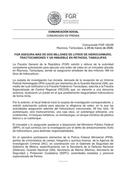 Reynosa, Tamaulipas. La Fiscalía General de la República aseguró alrededor de 2 millones, 189 mil litros de hidrocarburo, tras obtener una orden de cateo para incursionar en un inmueble localizado en esta fronteriza ciudad de Reynosa.