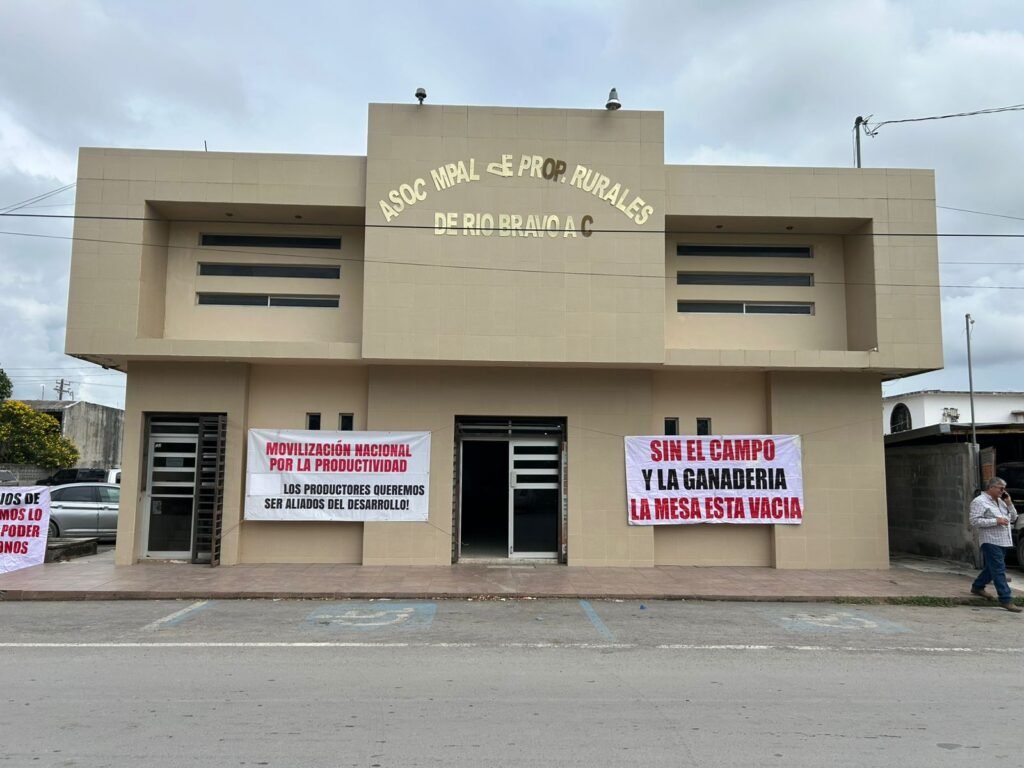 En la Asociación Municipal de Propietarios Rurales de Río Bravo se reunieron decenas de agricultores de Reynosa, Río Bravo, Valle Hermoso, Matamoros y Zona Ribereña. Se colocaron mantas en el exterior para visibilizar el movimiento.