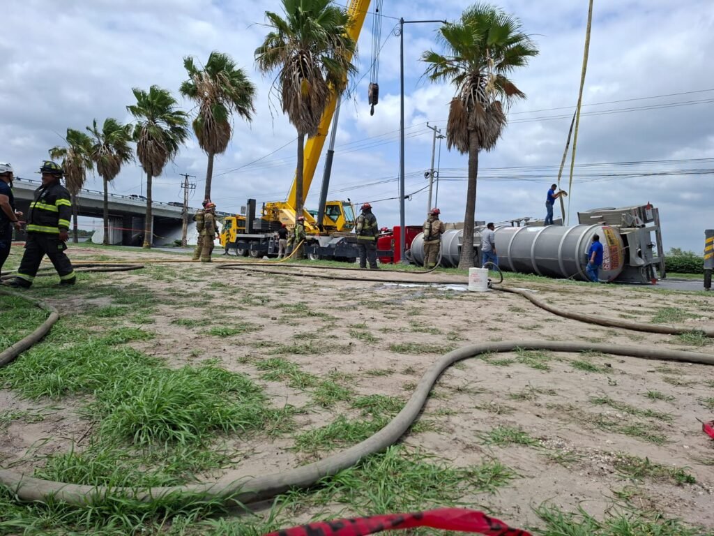 Reynosa, Tamaulipas. Al momento, elementos del Heroico Cuerpo de Bomberos se encuentran trabajando en la atención de una volcadura de tractocamión de articulación doble, registrada en el bulevar Miguel Hidalgo con libramiento a Monterrey, donde el paso fue cerrado, sobre y bajo el puente.