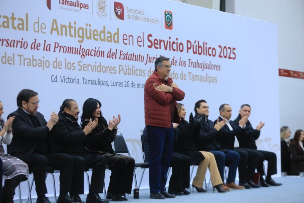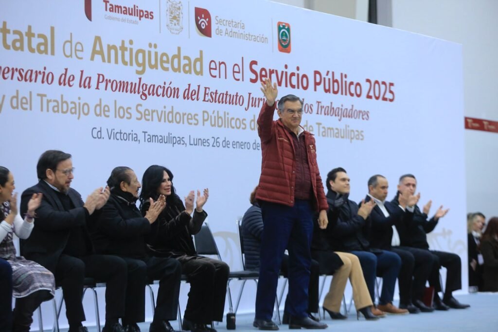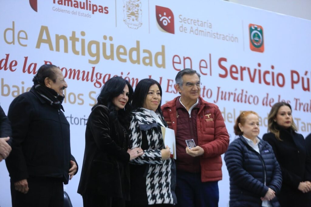 Durante la ceremonia en el Polyforum de esta capital, en la que se entregaron de manera simbólica 23 reconocimientos, medallas y estímulos económicos de un total de 1,453 a trabajadores que han cumplido entre 20 y 55 años de servicio en el Gobierno de Tamaulipas, el jefe del Ejecutivo estatal se refirió a la visita que realizó la presidenta Claudia Sheinbaum, quien trajo grandes beneficios y oportunidades para el desarrollo del estado y para seguir logrando el bienestar y la justicia social, así como coadyuvar al crecimiento y desarrollo de nuestra nación.