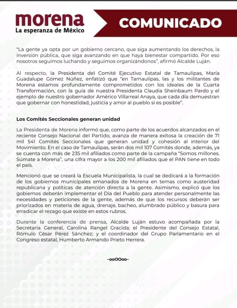 La Presidenta de Morena informó que, como parte de los acuerdos alcanzados en el reciente Consejo Nacional del Partido, avanza de manera exitosa la creación de 71 mil 541 Comités Seccionales que generan unidad y cohesión al interior del Movimiento. En el caso de Tamaulipas, serán dos mil 107 Comités donde, además, ya se cuenta con más de 235 mil afiliados como parte de la campaña “Somos millones. Súmate a Morena”, una cifra mayor a los 200 mil afiliados que el PAN tiene en todo el país.