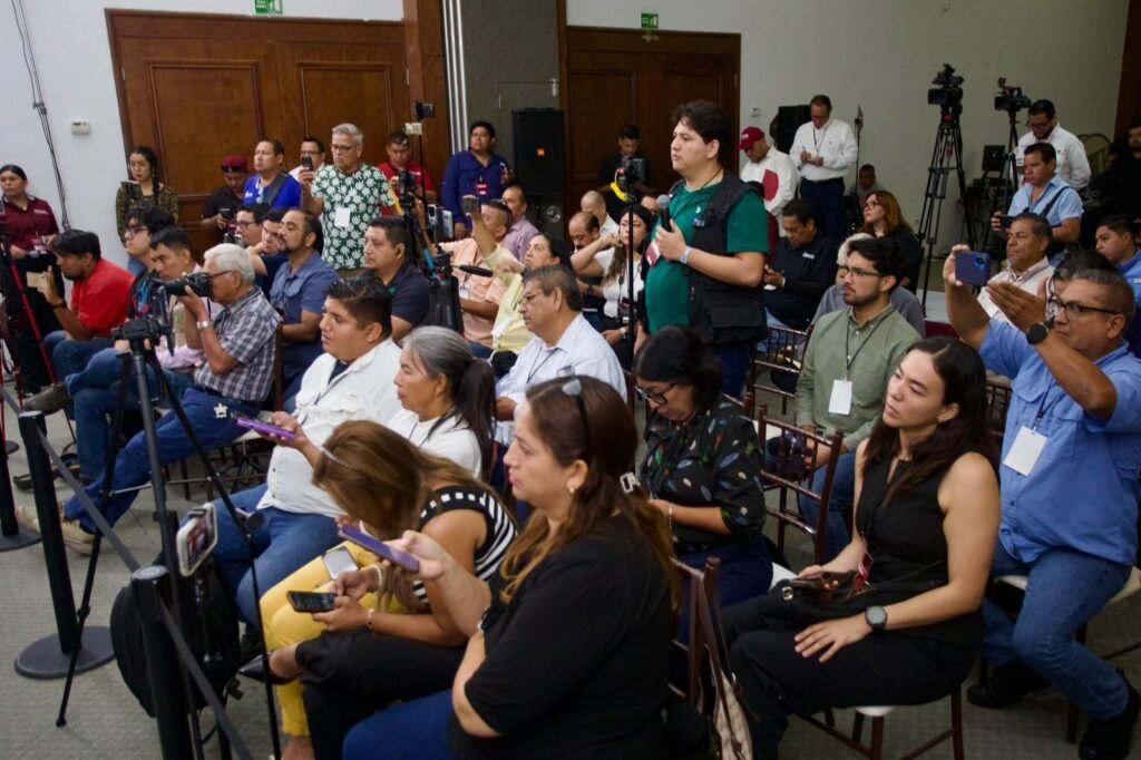 Durante la conferencia de prensa, Alcalde Luján estuvo acompañada por la Secretaria General, Carolina Rangel Gracida; el Presidente del Consejo Estatal, Rómulo César Pérez Sánchez; y el coordinador del Grupo Parlamentario en el Congreso estatal, Humberto Armando Prieto Herrera.