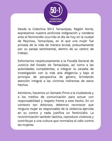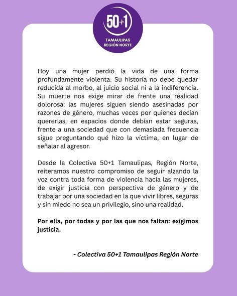 Reynosa, Tamaulipas. La colectiva “50 + 1” condenó enérgicamente el cruel feminicidio que ocurrió ayer en esta fronteriza ciudad de Reynosa.
