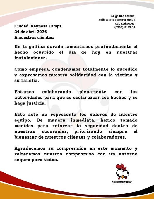 Previamente, la empresa restaurantera “La Gallina Dorada” emitió un comunicado donde lamenta profundamente el hecho ocurrido dentro de sus instalaciones y expresando su solidaridad con la víctima y su familia.