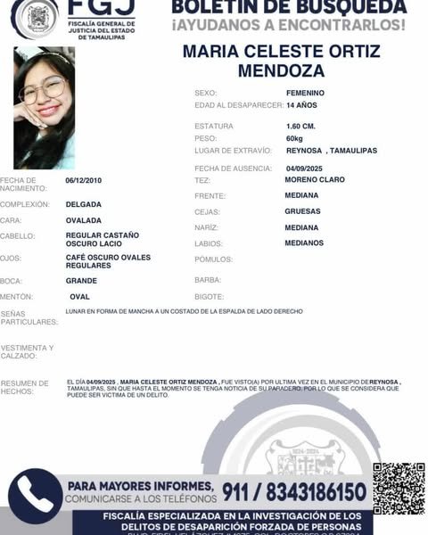 María Celeste Ortiz Mendoza, de 14 años, mide 1.60 de estatura, pesa 60 kilos, es de tez morena clara, frente mediana, cejas gruesas, nariz y labios medianos, complexión delgada, cara ovalada, cabello regular castaño oscuro lacio, boca grande y mentón oval.