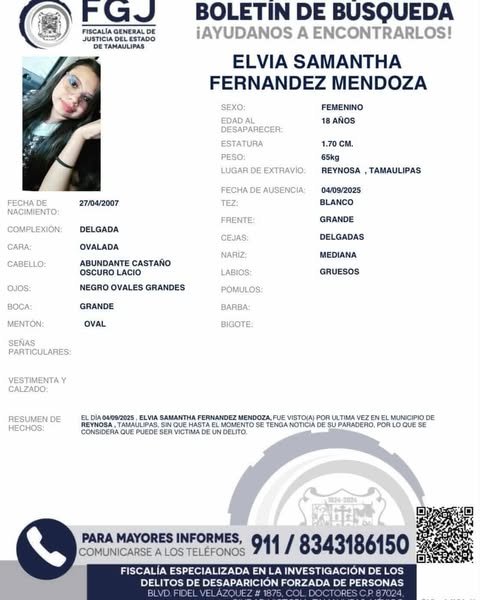Reynosa, Tamaulipas. Las autoridades presumen que los adolescentes Elvia Samantha Fernández Mendoza, de 18 años, José Manuel Ortiz Mendoza, de 13 y María Celeste Ortiz Mendoza, de 14 años son víctimas de un delito, ya que fueron sustraídos de sus casas el pasado 4 de septiembre y no se sabe su paradero.