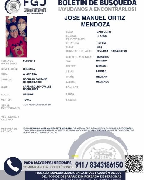 José Manuel Ortiz Mendoza, de 13 años, mide 1.50 metros de estatura, pesa 45 kilos, es moreno, de frente grande, cejas largas, nariz y labios medianos, complexión delgada, cara alargada, cabello regular castaño oscuro lacio, ojos cafés oscuro ovales regulares, boca grande y mentón oval. Tiene una cicatriz en una de las cejas.