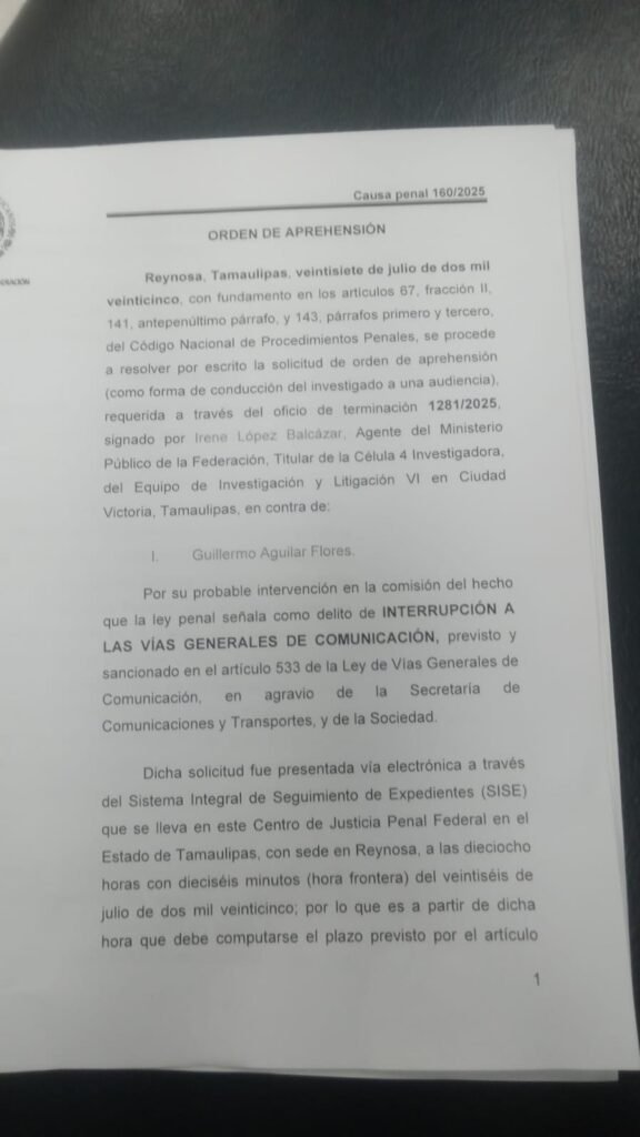 El documento con la orden de aprehensión establecida en la Causa penal 160/2025 indica lo siguiente: “Con fundamento en los artículos 67, fracción II, 141, antepenúltimo párrafo, y 143, párrafos primero y tercero del Código Nacional de Procedimientos Penales, se procede a resolver por escrito la solicitud de orden de aprehensión (como forma de conducción del investigado a una audiencia), requerida a través del oficio de terminación 1282/2025 signado por Irene López Balcázar, Agente del Ministerio Público de la Federación, Titular de la Célula 4 Investigadora del Equipo de Investigación y Litigación VI en Ciudad Victoria, Tamaulipas, en contra de: