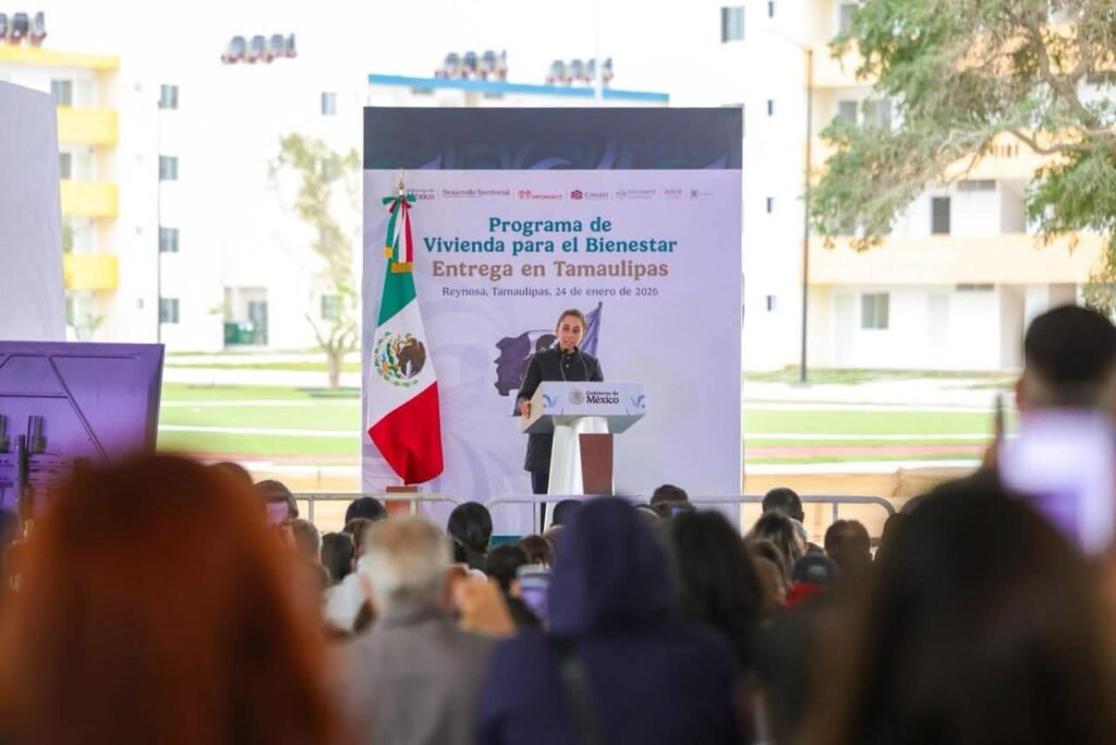 Reynosa, Tamaulipas. “Me da mucho gusto estar hoy aquí en Reynosa, Tamaulipas, para entregar beneficios de los programas del Gobierno de la República. Agradezco la presencia del Gobernador Constitucional de Tamaulipas, Doctor Américo Villarreal Anaya, y del Presidente Municipal de Reynosa, Carlos Peña Ortiz”, dijo la Presidenta al encabezar la entrega de beneficios de programas federales, de Vivienda del Bienestar y Pensión para Mujeres Bienestar.