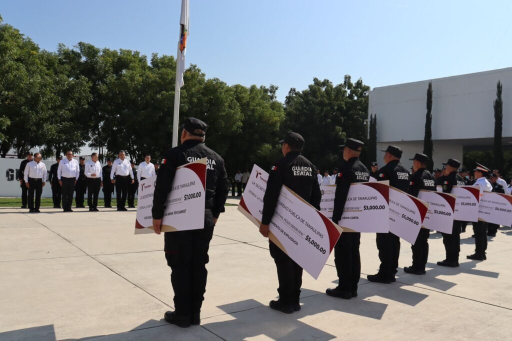 Con una ceremonia encabezada por el secretario de Seguridad Pública de Tamaulipas, Carlos Arturo Pancardo Escudero, se recibió a los siete elementos galardonados, entre ellos, una integrante de la Dirección de Tránsito Estatal, quienes durante el pasado mes aseguraron 14 armas largas, cinco armas cortas y cuatro explosivos.