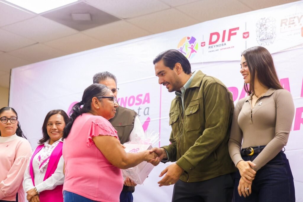 Reynosa, Tamaulipas. En un acto de humanismo y solidaridad a la salud de las mujeres reynosenses, el Alcalde Carlos Peña Ortiz y la Presidenta del Voluntariado DIF-Reynosa, Alejandra Yelitza Garza, entregaron prótesis mamarias externas a pacientes que sufrieron cáncer, un importante acto celebrado este jueves 30 de octubre durante el Mes Rosa.
