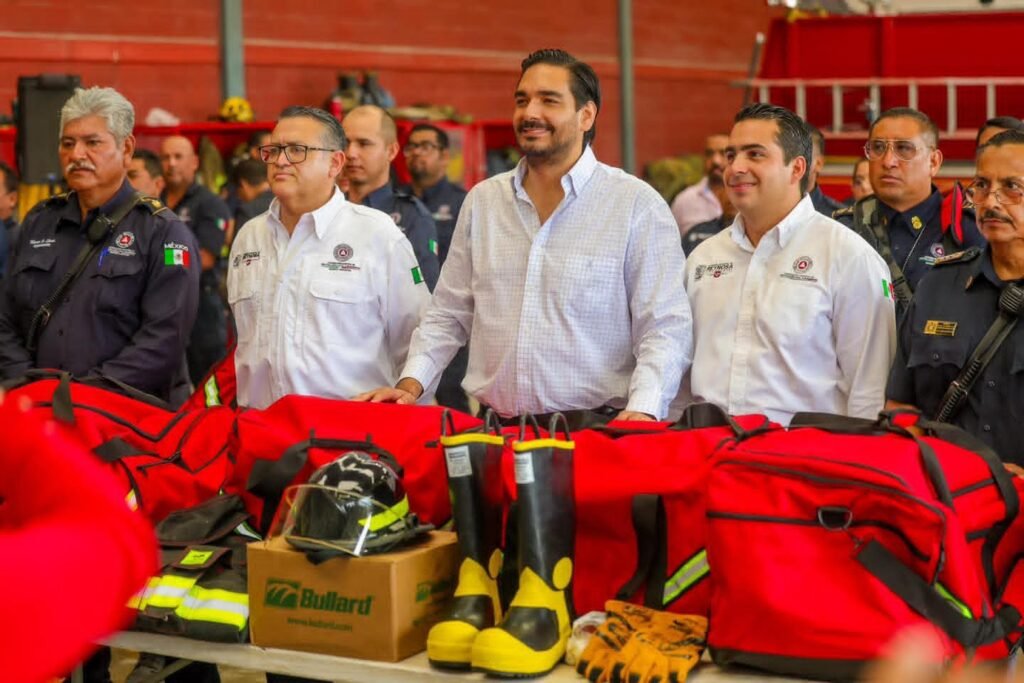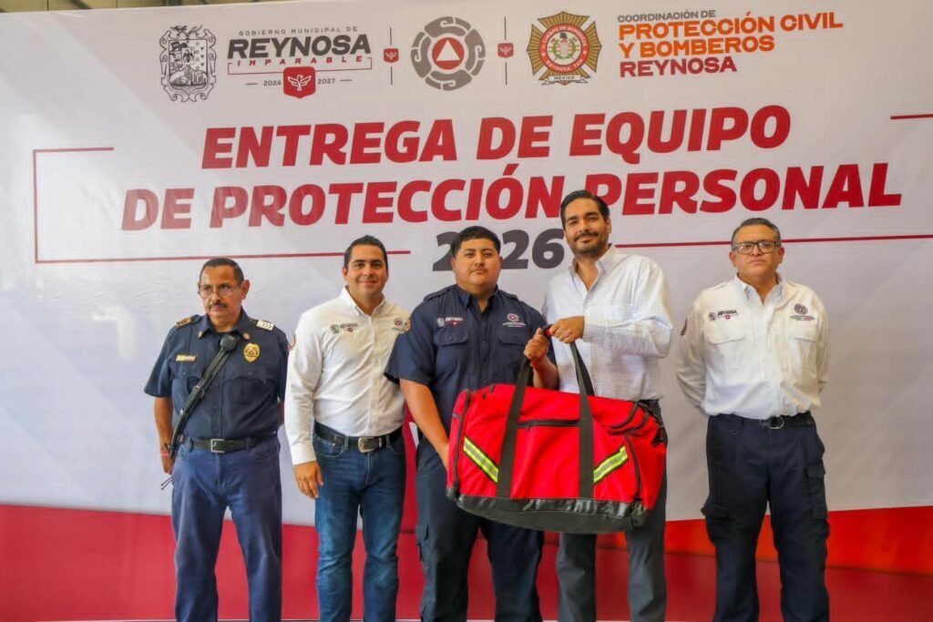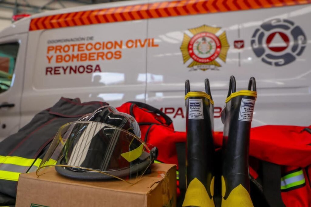 Reynosa, Tamaulipas. Con la finalidad de dotar de más equipos para la seguridad personal de los elementos de Bomberos de Reynosa, el Presidente Municipal Carlos Peña Ortiz entregó al Coordinador de Protección Civil, Javier Iván Lam Cantú los utensilios vitales para el desarrollo de su labor, Casco, Escafandra, Chaquetón, Tirantes, Guantes, Pantalonera, Botas y mochila para transportarlos.