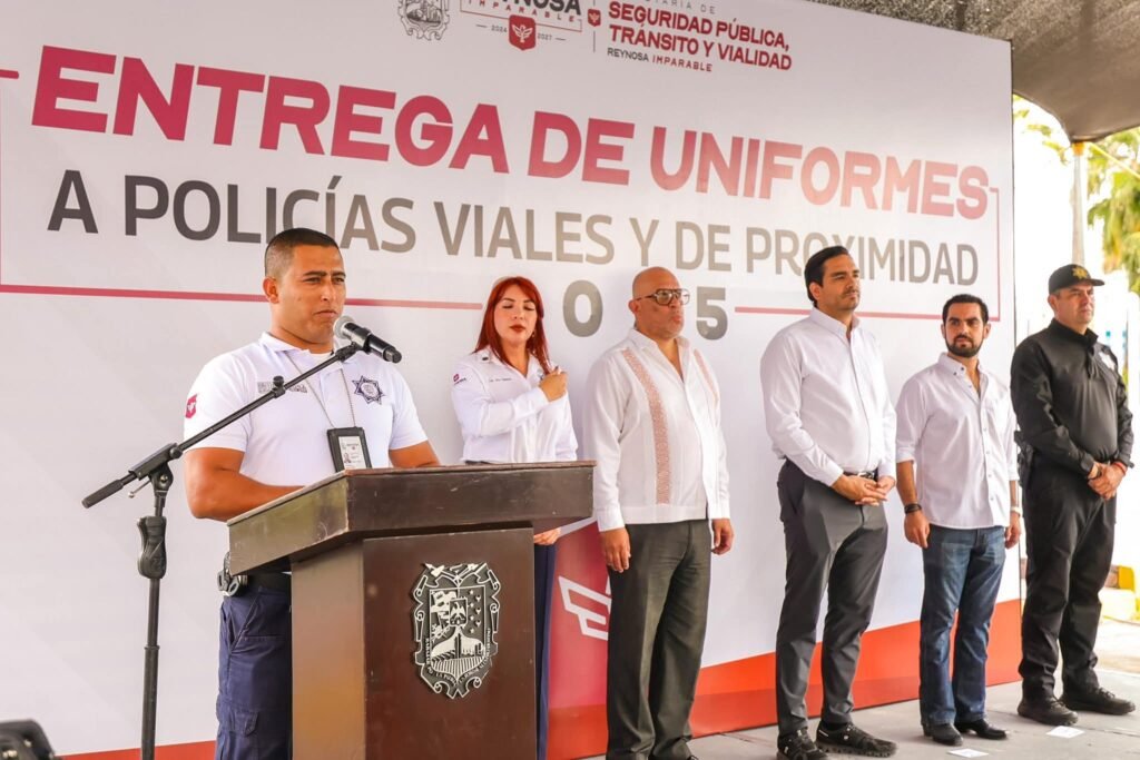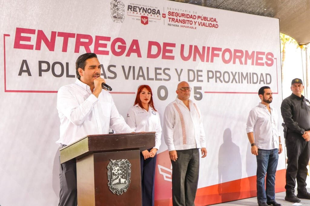 En el evento, el Alcald expresó que: “con estos uniformes, las Policías en Reynosa obtendrán más confianza en su identidad con los ciudadanos, y se comprometió a seguir entregando beneficios a ambas corporaciones para garantizar la seguridad y el bienestar de todos los reynosenses “, dijo, acompañado por el Secretario de Seguridad Público, Tránsito y Vialidad, Geovanni F. Barrios Moreno; la Directora de Tránsito, Iris A. Chavira Ríos y el Contralor Ernesto Gómez De la Peña.