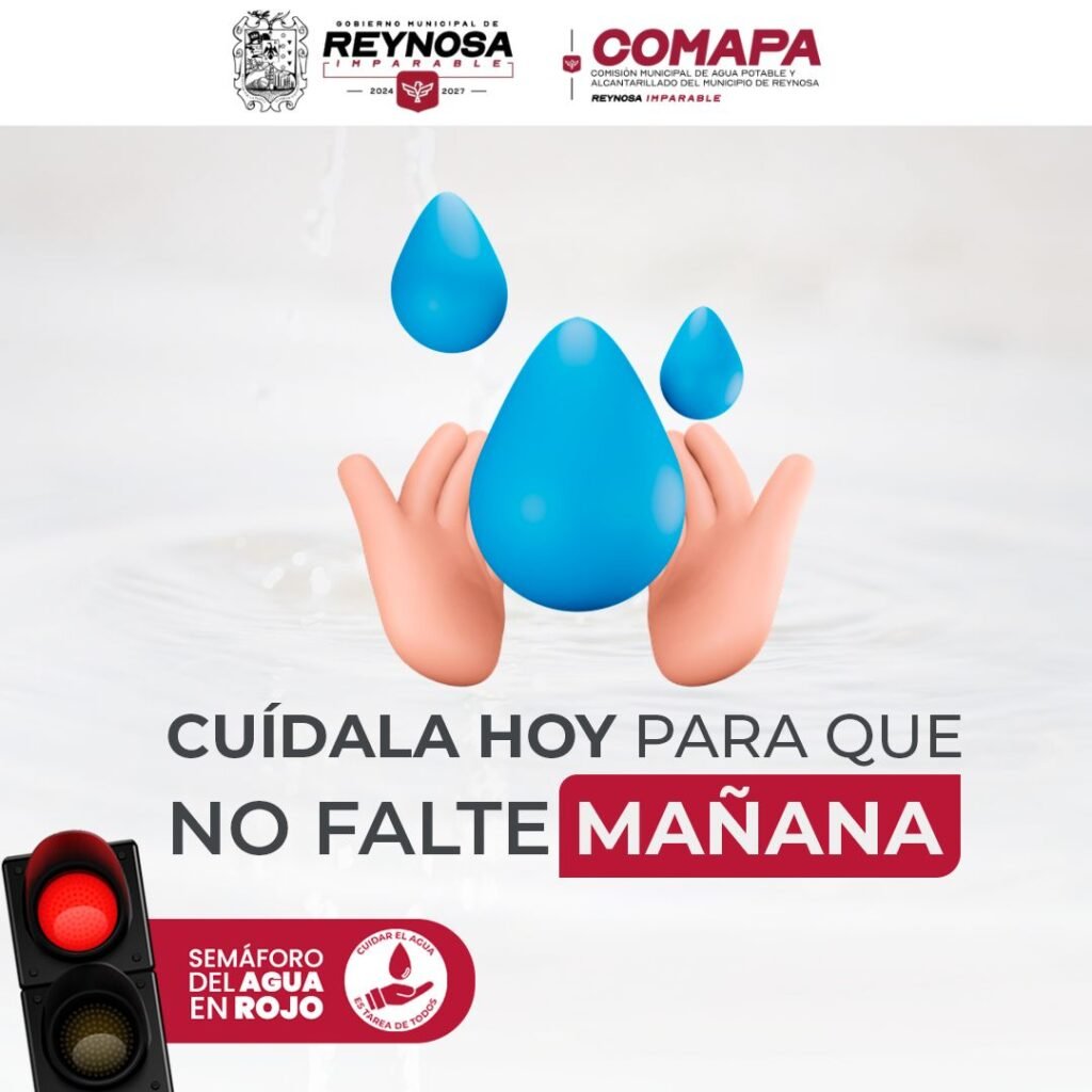 Reynosa, Tamaulipas. La Comisión Municipal de Agua Potable y Alcantarillado de Reynosa hace un llamado urgente a toda la ciudadanía para redoblar las acciones de cuidado y uso responsable del agua, ante la importancia de preservar este recurso. Con el semáforo del agua en rojo, es fundamental que cada habitante contribuya a evitar el desperdicio, adoptando hábitos que permitan garantizar el suministro en los hogares y comunidades de nuestra ciudad.