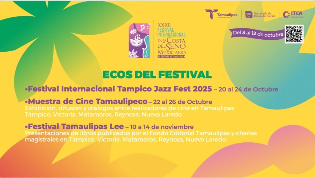 Se trata, explicó, de la Muestra de Cine Tamaulipeco, con una cartelera que se presentará en los municipios de Victoria, Reynosa y Matamoros del 22 al 26 de octubre; mientras que del 10 al 22 de noviembre tendrá lugar un Encuentro de Literatura, dentro del programa “Tamaulipas Lee”. De manera especial, destacó la celebración del Tampico Jazz Fest, que tradicionalmente se disfruta cada año en ese puerto y que, en esta edición, se realizará del 20 al 24 de octubre.