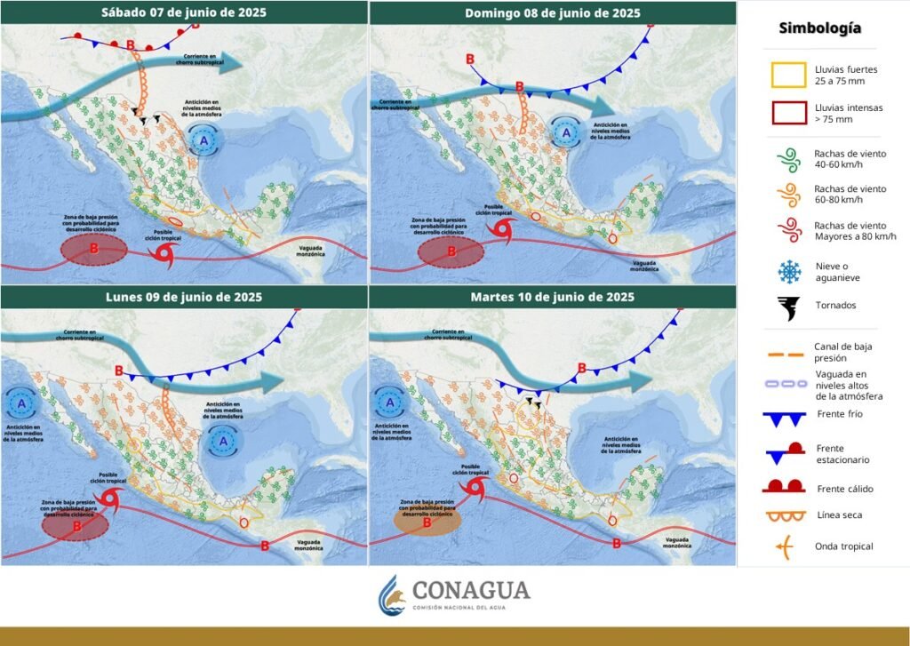 El Servicio Meteorológico nacional advierte sobre la presencia de un sistema de baja presión con potencial ciclónico o posible ciclón tropical cerca de la costa del Pacífico, canales de baja presión y línea seca con corriente en chorro subtropical y circulación anticiclónica en el norte.