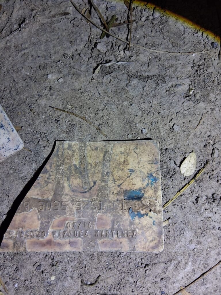 Edith González comunicó esta tarde/noche que en la prospectiva de hoy, pudieron localizar un cráneo incompleto, varias costillas y una tarjeta bancaria a nombre de Alejandro Vázquez Martínez, con el número de cuenta xxx9 3035 3851 5198, sin apreciarse el logotipo de la institución a la que pertenece.