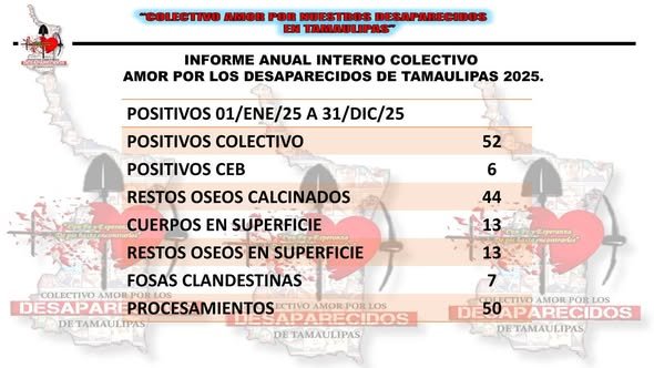 Edith González notificó hace unos días que durante el año 2025 se tuvieron 52 hallazgos positivos por parte del Colectivo, 6 por parte del Consejo Estatal de Búsqueda (CEB), 44 restos calcinados, 13 cuerpos en superficie, 13 restos óseos en superficie, 7 fosas clandestinas y 50 procesamientos.