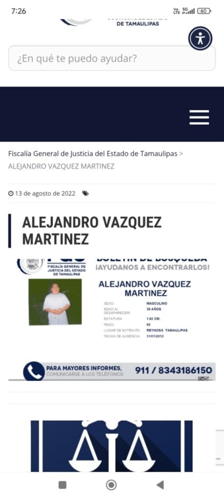Alejandro Vázquez, de 36 años de edad, de 1.62 metros de altura y un peso de 85 kilogramos, fue reportado como desaparecido en esta ciudad de Reynosa. La coincidencia entre el nombre del reporte y el de la tarjeta bancaria hace suponer que se trata de la misma persona. Sin embargo, aún se tendría que confirmar con sus familiares y mediante las pruebas periciales necesarias.