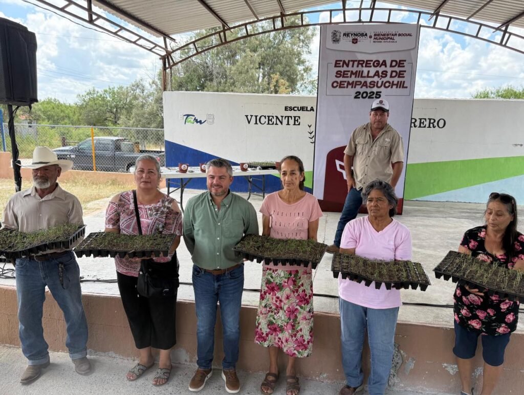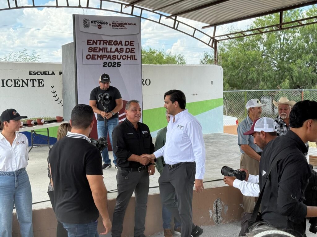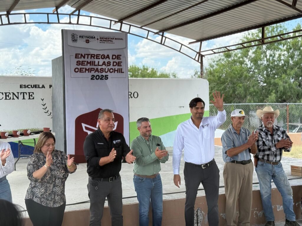 Reynosa, Tamaulipas. Con la presencia del Alcalde Carlos Peña Ortiz y del Secretario de Bienestar del Municipio, Héctor Olivares Zavala, se hizo entrega de semillas de cempazúchil en charola de germinación a habitantes del ejido Llorona Nueva.