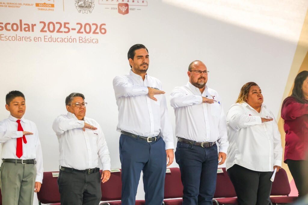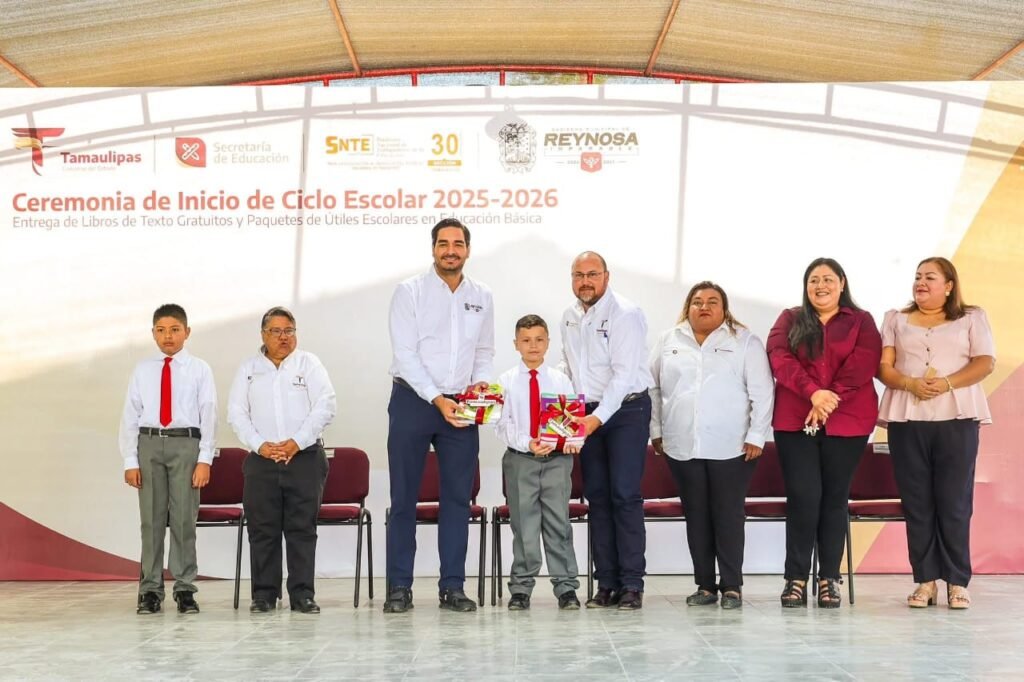 Reynosa, Tamaulipas. El Presidente Municipal Carlos Peña Ortiz, acompañó al Secretario General del Gobierno del Estado, Héctor Joel Villegas González, representante del Gobernador Constitucional de Tamaulipas, Doctor Américo Villarreal Anaya, en la Ceremonia de Inicio de Ciclo Escolar 2025-2026 y Entrega de Libros de Texto Gratuitos y Paquetes de Útiles Escolares en Educación Básica en la escuela primaria Lauro Aguirre de la colonia Benito Juárez.