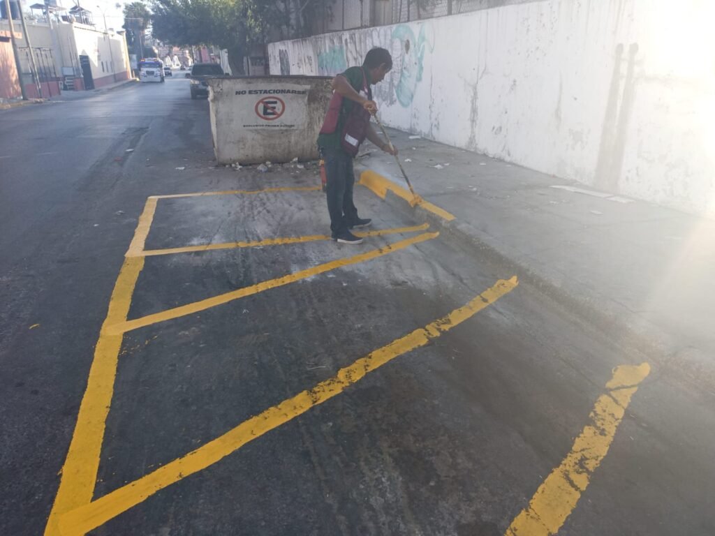 Este día continuaron los trabajos de pintado de líneas amarillas que delimitan el área del contenedor de basura en la calle Juárez, esquina con Veracruz, en la colonia Rodríguez.