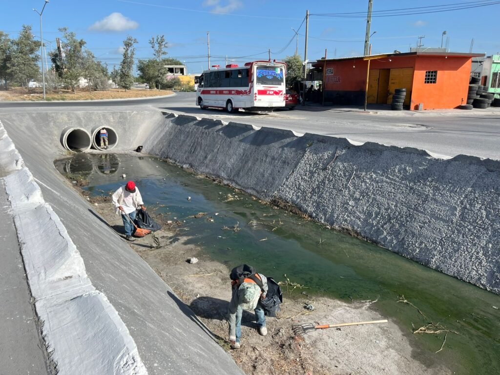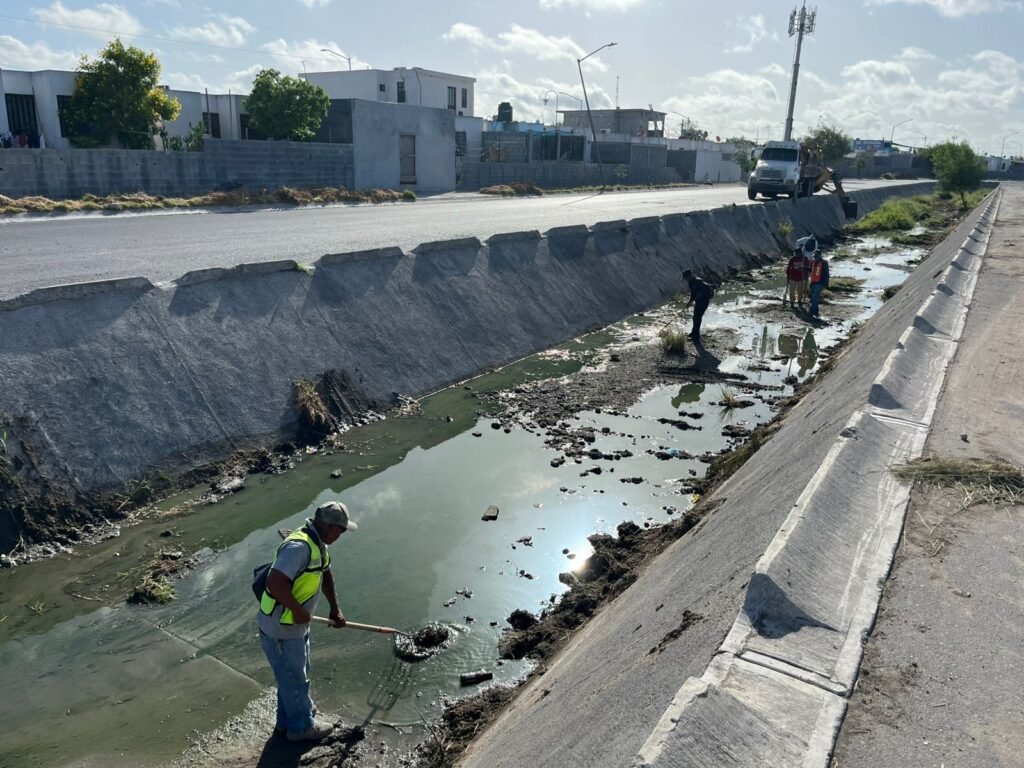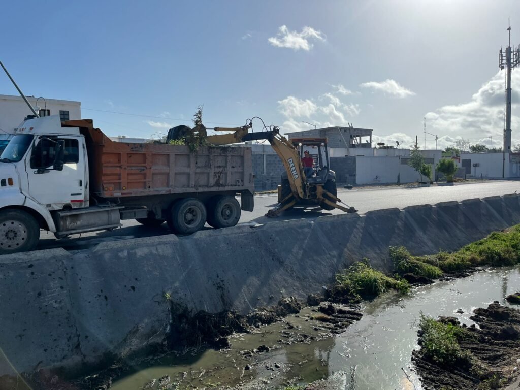 Cumpliendo con las indicaciones, personal de la dependencia se avocaron a limpiar el canal pluvial que se ubica sobre el bulevar Monte de los Olivos, con el apoyo de una retroexcavadora y un camión.