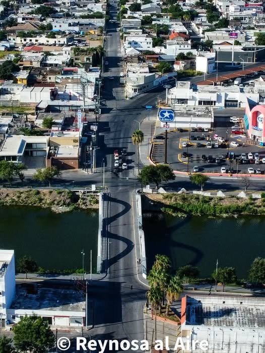 Reynosa, Tamaulipas. La curiosa lente del fotógrafo aéreo Martín Cavazos logró captar la curiosa sombra serpenteante que se dibuja sobre el puente vehicular Morelos y canal Anzaldúas.