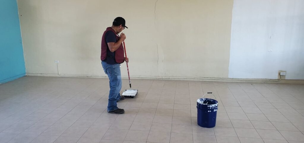 Se continúa con el apoyo de personal para el pintado de aulas en el jardín de niños María E. Pereira, ubicado en la calle Hawai con prolongación Londres, de la colonia Cañada.