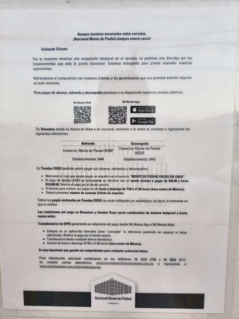 En un escrito dirigido a sus clientes, colocado en la fachada del inmueble ubicado sobre el bulevar Hidalgo, entre calle Matamoros y Padres Mier, la empresa señala que todos los objetos se encuentran resguardados en bóvedas, bajo estrictas medidas de vigilancia, además de que cada objeto empeñado está inventariado, asegurado y custodiado.