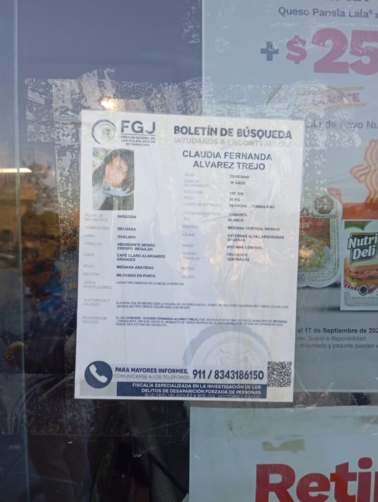 Reynosa, Tamaulipas. Hoy se cumplen cuatro días de la desaparición de la adolescente Claudia Fernanda Álvarez Trejo y su familia sigue en su búsqueda, apoyada por integrantes del colectivo Amor por los Desaparecidos.