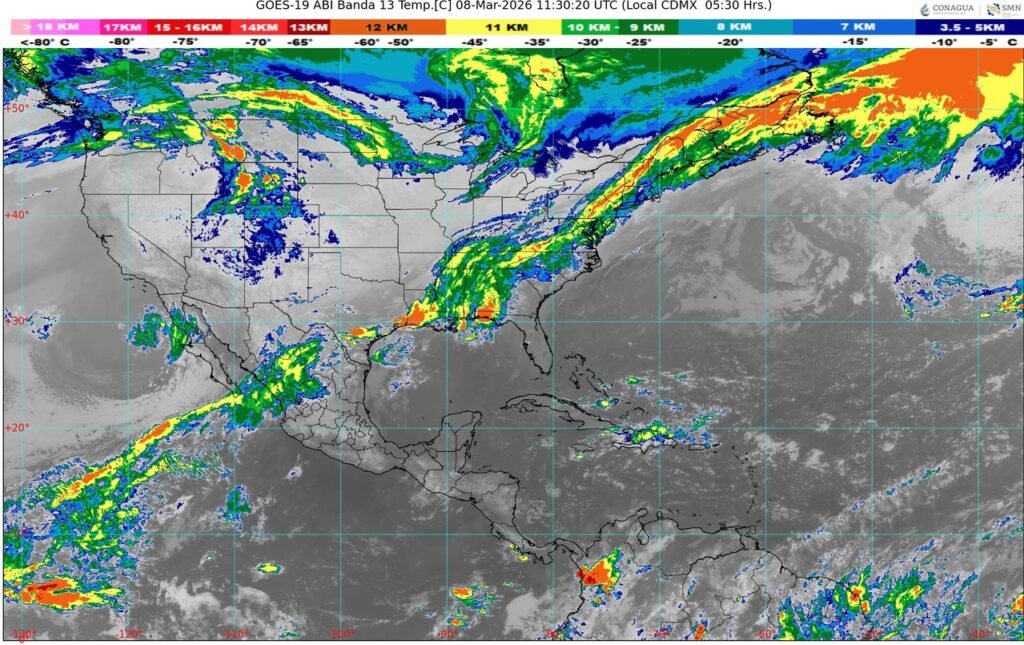 Reynosa, Tamaulipas. Una extensa área de convección se ha formado sobre Reynosa y la región. Los servicios meteorológicos dan hasta un 80% de probabilidades de lluvia para las próximas horas. Esto, por la llegada del Frente Frío número 39, combinada con una corriente en chorro subtropical que favorece la humedad atmosférica.