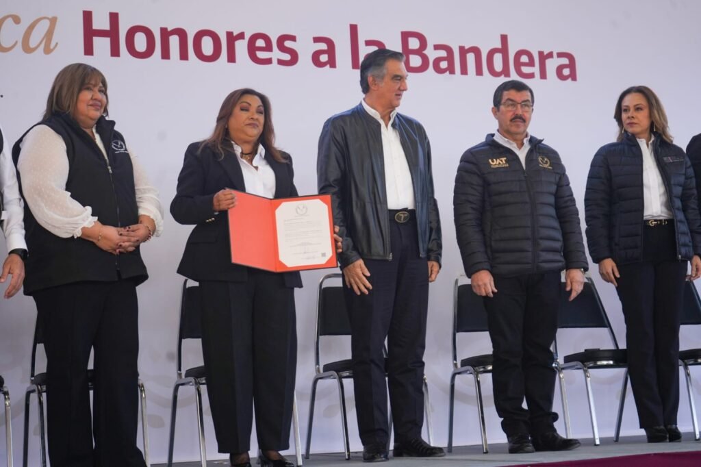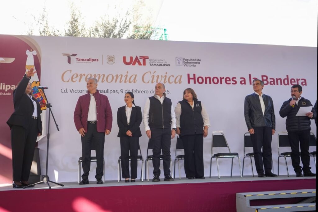 Ciudad Victoria, Tamaulipas. El gobernador Américo Villarreal Anaya, junto con el rector de la Universidad Autónoma de Tamaulipas (UAT), Dámaso Anaya Alvarado, encabezó este lunes la ceremonia de honores a la bandera y atestiguó la toma de protesta de la Dra. María Guadalupe Vázquez Salazar como directora de la Facultad de Enfermería Victoria para el periodo 2026-2029.