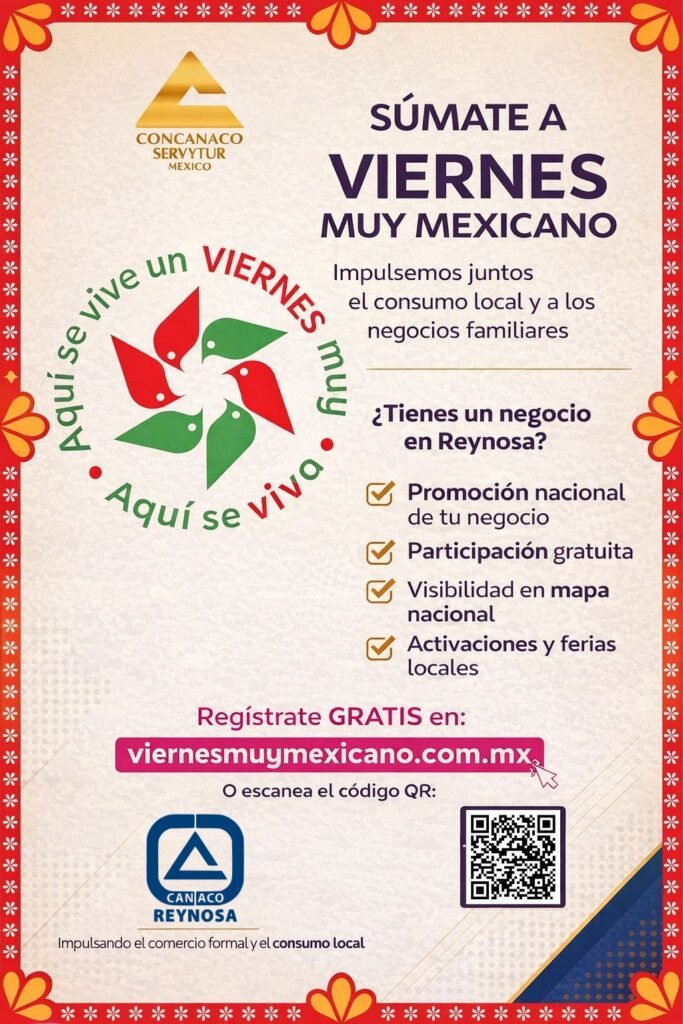 y Turismo de Reynosa (CANACO Reynosa) informó que el próximo 27 de febrero se llevará a cabo en nuestra ciudad una nueva edición de “Viernes Muy Mexicano”, estrategia nacional
