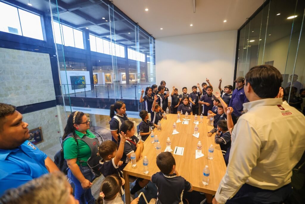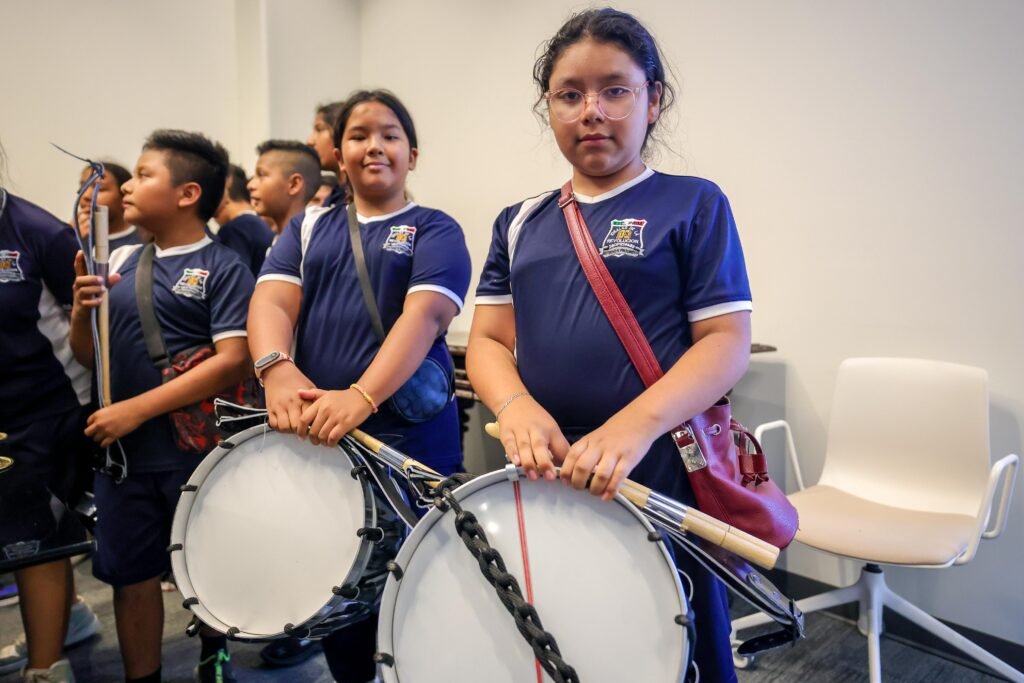 El Presidente Carlos Peña Ortiz recibió la visita de los niños y niñas que forman la Banda de Guerra de la escuela primaria Ideales de la Revolución, turno matutino, a quienes donó tambores, trompetas y accesorios de parte del Gobierno Municipal de Reynosa.