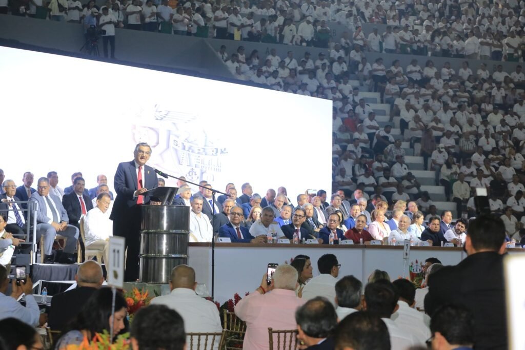 Desde el Centro de Convenciones de Ciudad Madero, junto con el secretario del Trabajo, Marath Bolaños López, representante de la presidenta Claudia Sheinbaum, y el director general de Pemex, Víctor Rodríguez Padilla, el gobernador de Tamaulipas recordó que él también fue “petrolero”.
