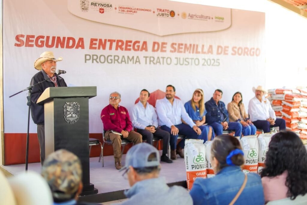Reynosa, Tamaulipas. “Me uno a las palabras de agradecimiento y reconocimiento hacia Carlos Víctor Peña Ortiz, Alcalde de Reynosa, por el programa Trato Justo, que ha sido un verdadero apoyo para las familias campesinas”, dijo con emoción ante familias del campo, el señor Eleodoro Quintero Ballesteros, en presencia de la Senadora Maki Esther Ortiz Domínguez y los Diputados Casandra Priscila De los Santos Flores, Claudia Alejandra Hernández Sáenz y Juan Carlos Zertuche Romero.