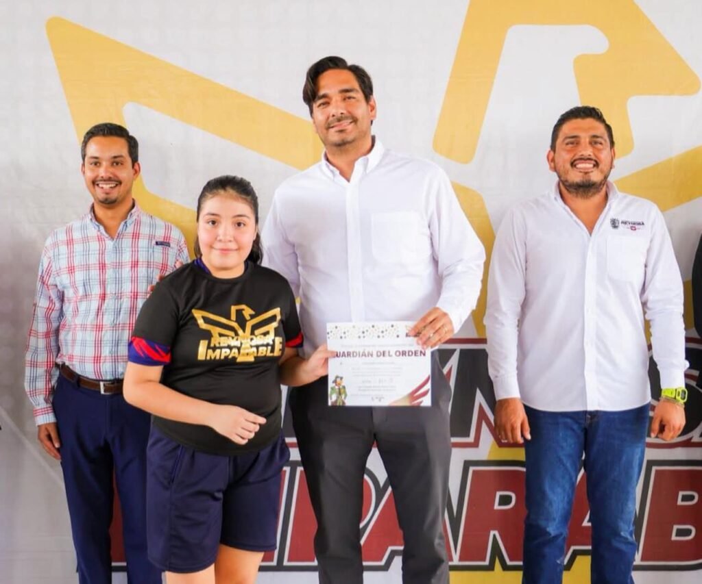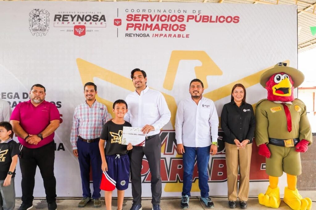 Reynosa, Tamaulipas. “El día de hoy ya son Guardianes del Orden, aprendieron a cuidar el medio ambiente, no tirar basura; todo eso es importante para nuestra ciudad, debemos evitar que haya quien tire basura en lugares clandestinos porque debe ir en el basurero o el contenedor, gracias por ayudar”, dijo el Alcalde a la emocionada comunidad escolar de la Primaria Moctezuma.
