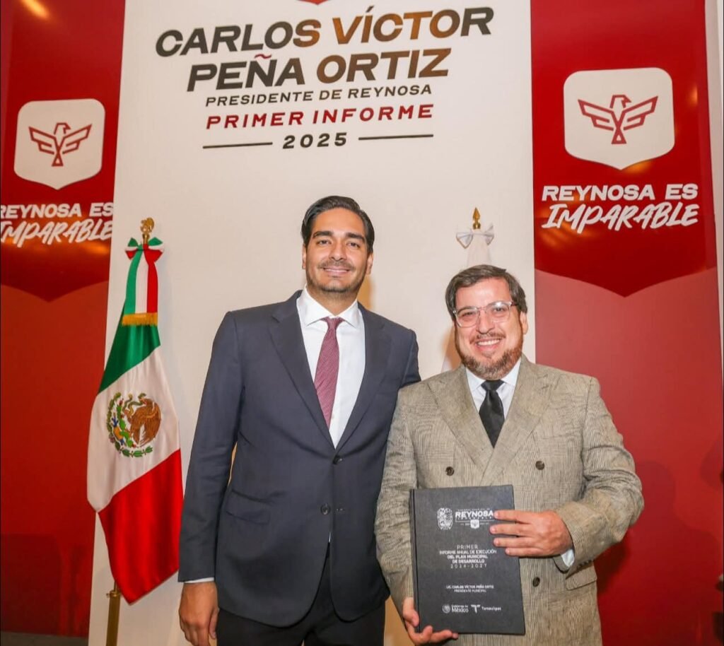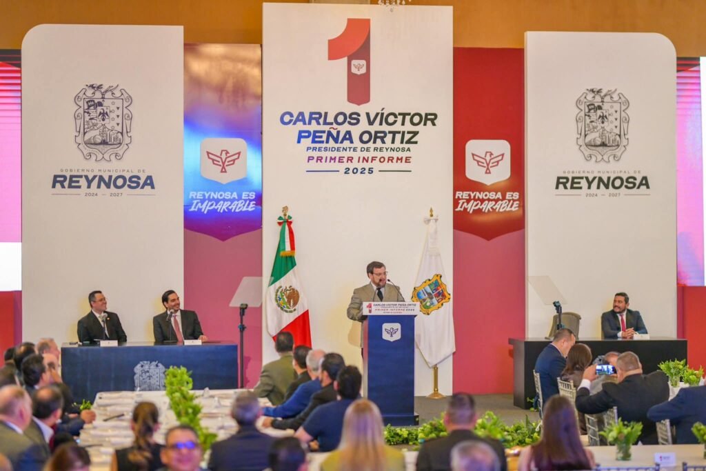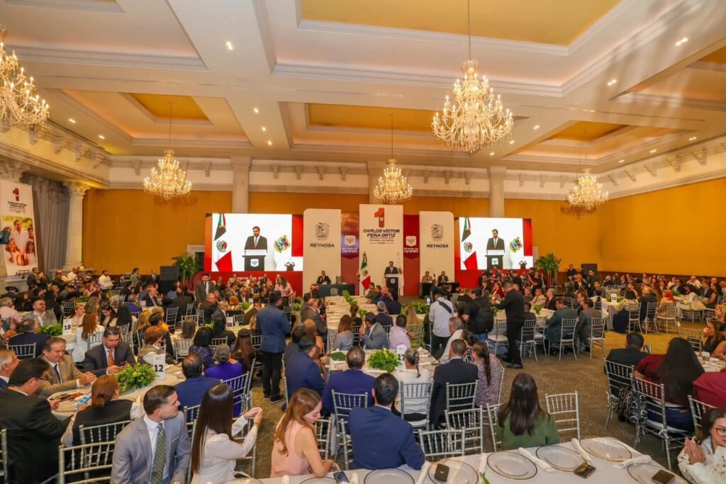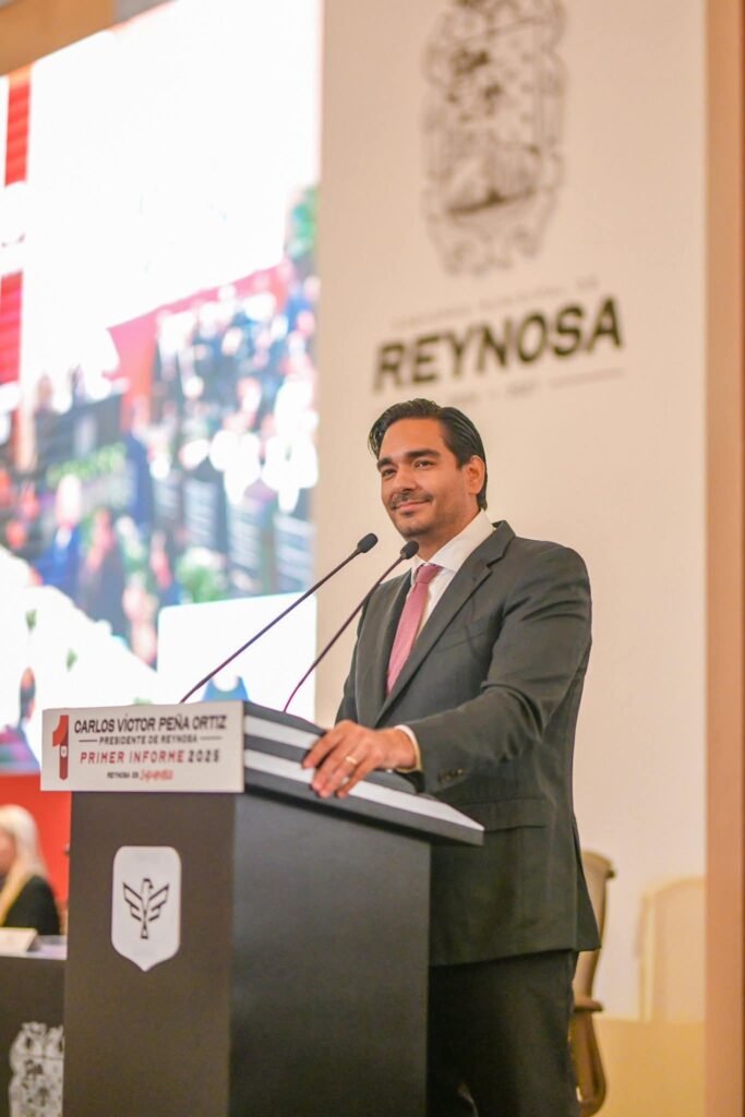 Reynosa, Tamaulipas. El Presidente Municipal Carlos Peña Ortiz presentó el Primer Informe de su Gobierno, con la presencia del Secretario de Educación, Miguel Ángel Valdez García, representante del Gobernador Constitucional de Tamaulipas, Doctor Américo Villarreal Anaya.