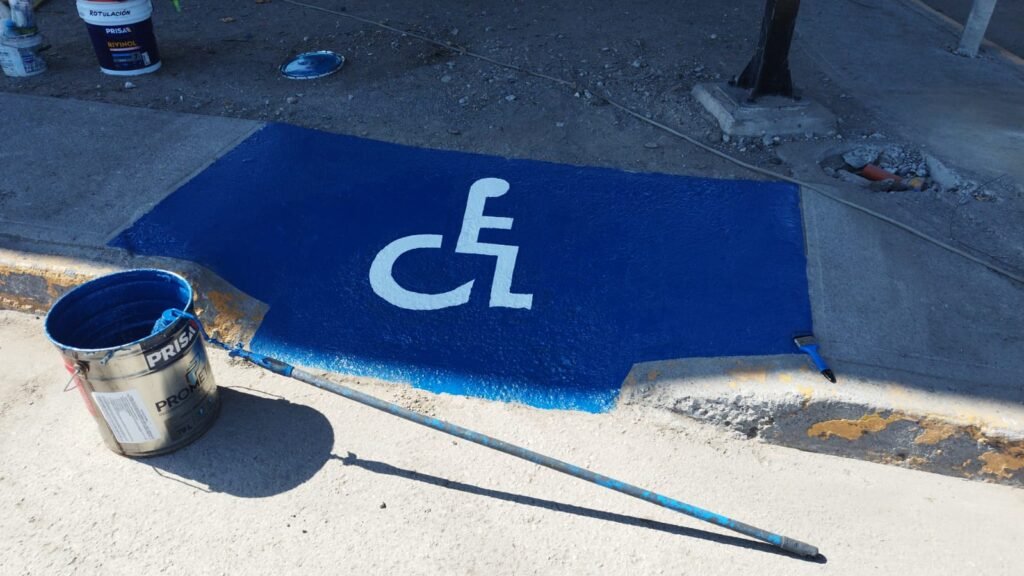 Reynosa, Tamaulipas. La Secretaría de Servicios Públicos del Gobierno de Reynosa atendió instrucciones del Presidente Carlos Peña Ortiz para complementar la rehabilitación y mantenimiento de vialidades con rotulación de rampas para personas con discapacidad.