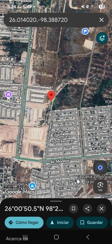 El sitio se encuentra a la altura de la calle Punta Oeste, al lado de un canalito (26.014020 grados latitud norte y 98.388720 grados longitud oeste). Ahí se localizó el cuerpo tapado con llantas, piedras y cartón. “Fueron, lo aventaron y lo taparon”-dijo la activista.