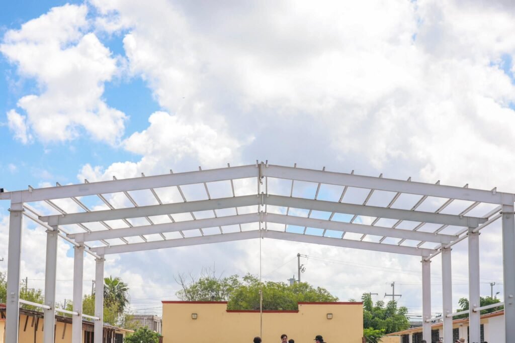 Reynosa, Tamaulipas. El Alcalde Carlos Peña Ortiz supervisó una obra en desarrollo que aporta más apoyo a la educación en las colonias populares, la construcción de una techumbre metálica de más de 500 metros cuadrados en la Escuela Primaria “Profr. Julián Ernesto Zamora Rivas”.