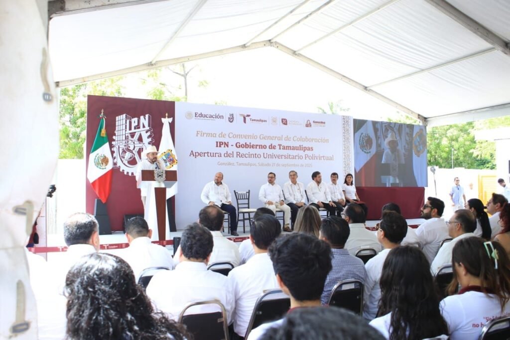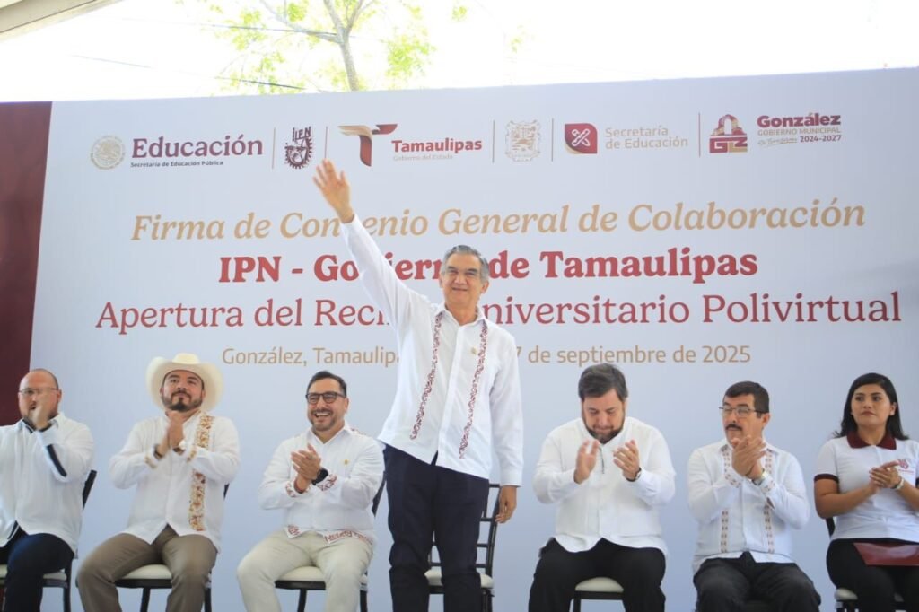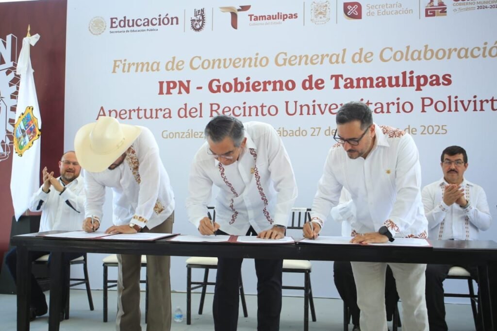 González, Tamaulipas. El gobernador Américo Villarreal Anaya firmó el convenio de colaboración con el Instituto Politécnico Nacional e inauguró el Recinto Universitario Polivirtual, una nueva plataforma académica con la calidad y la excelencia educativa que distingue a esta prestigiada institución y que, por primera vez, se pone en marcha en todo el país.
