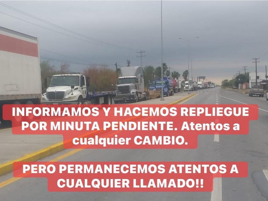 “Nos están informando del Frente Nacional que hay una propuesta del Gobierno Federal de que nos retiremos de las carreteras, que sigamos pendientes y que estemos preparados en caso de que no sea cierto que van a firmar la minuta, que es el acuerdo nacional. Entonces los puentes internacionales van a seguir cerrados, solamente que liberemos las carreteras. Vamos a esperar que sea hoy mismo que firmen la minuta. En caso que no sea así mañana seguimos igual y con más fuerza”-indica un mensaje.