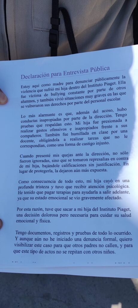 Durante más de un año mi hija fue víctima de bullying físico, verbal y digital por parte de una compañera. Estos hechos fueron reportados formalmente con evidencia: Golpes, insultos y hasta la grabación ofensiva de un video desde el celular de mi propia hija sin consentimiento. Pese a todo eso, la escuela no ofreció ningún plan de contención emocional ni medida efectiva de protección”.