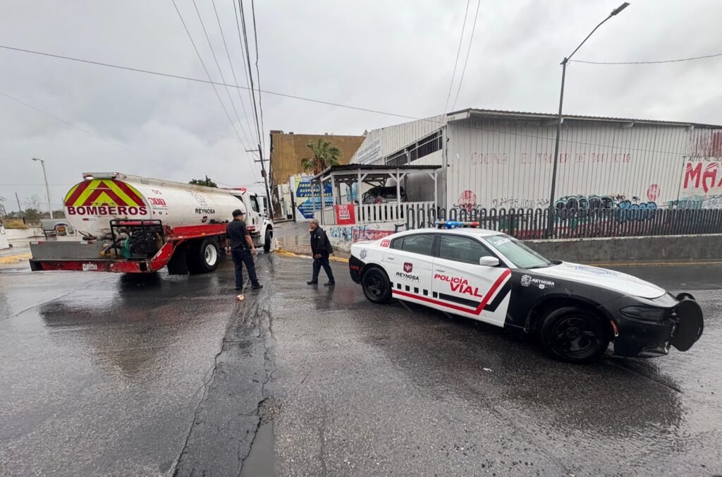 Reynosa, Tamaulipas. El Alcalde Carlos Peña Ortiz y las dependencias municipales ejecutan acciones para atender las zonas afectadas por la lluvia en Reynosa, activando cuadrillas de la Secretaría de Servicios Públicos principalmente y con recorridos de la Coordinación de Protección Civil y Bomberos y de Tránsito y Vialidad.