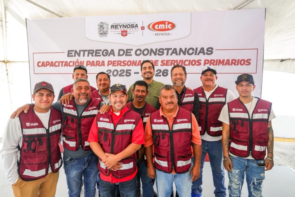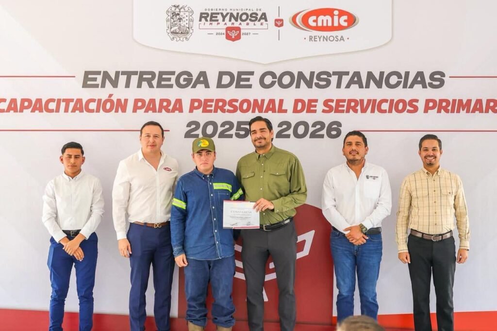 Reynosa, Tamaulipas. El Presidente Municipal Carlos Peña Ortiz entregó los reconocimientos que trabajadores de Servicios Públicos del R. Ayuntamiento obtuvieron al aprobar los cursos de capacitación impartidos por la Cámara Mexicana de la Industria de la Construcción, CMIC, que preside Roberto Aviles Arizpe.